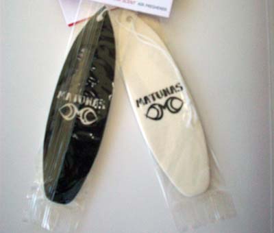 Matunas Surf Wax Coconut Scented Air Fresheners are handmade into a two toned surfboard shape, one side is white, the other is black, and scented with organic coconuts. They are great for keeping your car, office, bathroom, boat, and house to smell like beautiful coconuts.