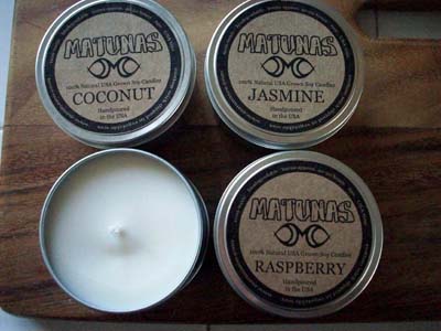 Matunas Candles are hand poured and made from 100% all natural soy from a farm in the U.S.A. It is non-toxic, biodegradable, and made with a cotton wick dipped in vegetable wax. The 6 oz. tins they come in are also made in the U.S.A. Estimated Burn Time: 40-50 hours